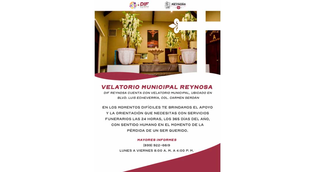 Reynosa, Tam.- En momentos difíciles, el Sistema DIF-Reynosa, que encabeza Carlos Luis Peña Garza, brinda respaldo solidario a las familias de nuestra ciudad, a través del Velatorio Municipal, ubicado en el Boulevard Luis Echeverría, en la colonia Carmen Serdán.