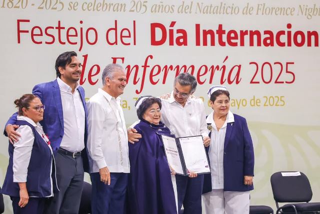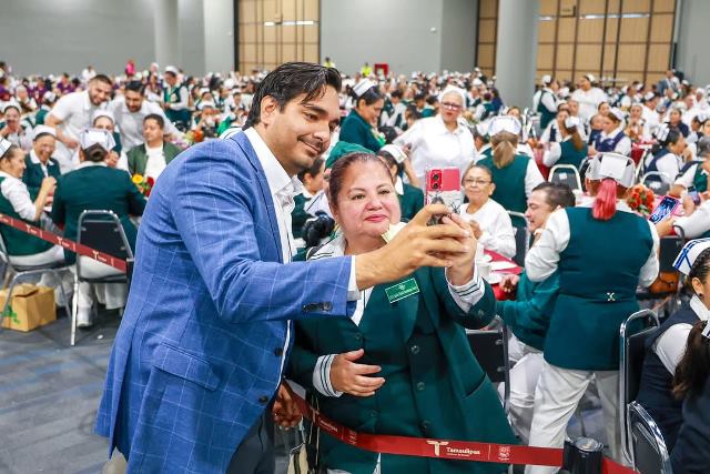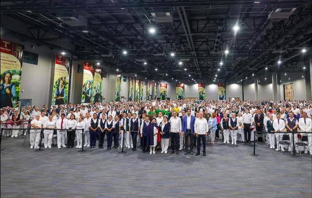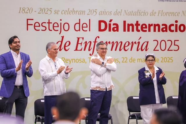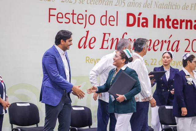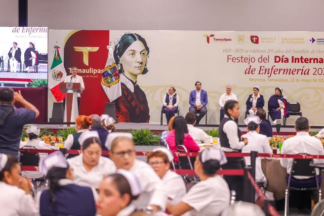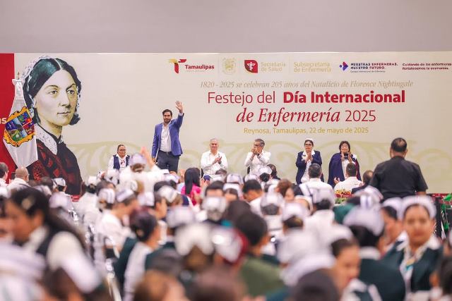 Reynosa, Tam.- Un festejo por el Día Internacional de Enfermería 2025, fue ofrecido a Enfermeras y Enfermeros en Reynosa, por el Gobernador Constitucional de Tamaulipas, Doctor Américo Villarreal Anaya, donde fue acompañado por el Presidente Municipal, Carlos Peña Ortiz y por el Secretario de Salud de la entidad, Vicente Joel Hernández Navarro.