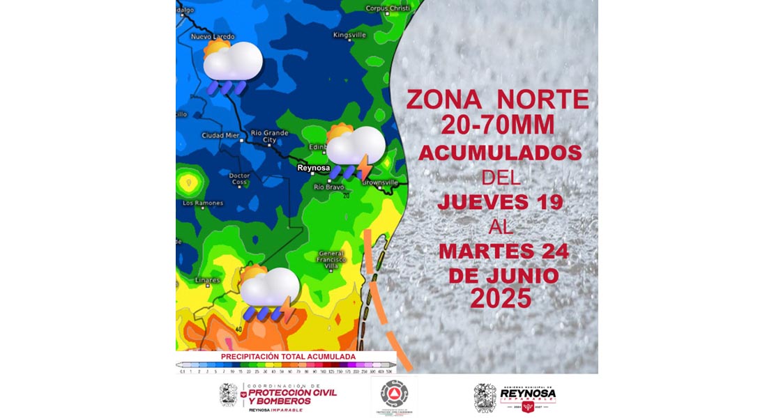 El Gobierno Municipal invita a los reynosenses a mantenerse informados y tomar precauciones ante posibles acumulaciones de agua, en canales, drenes y vialidades susceptibles a los efectos de la lluvia.