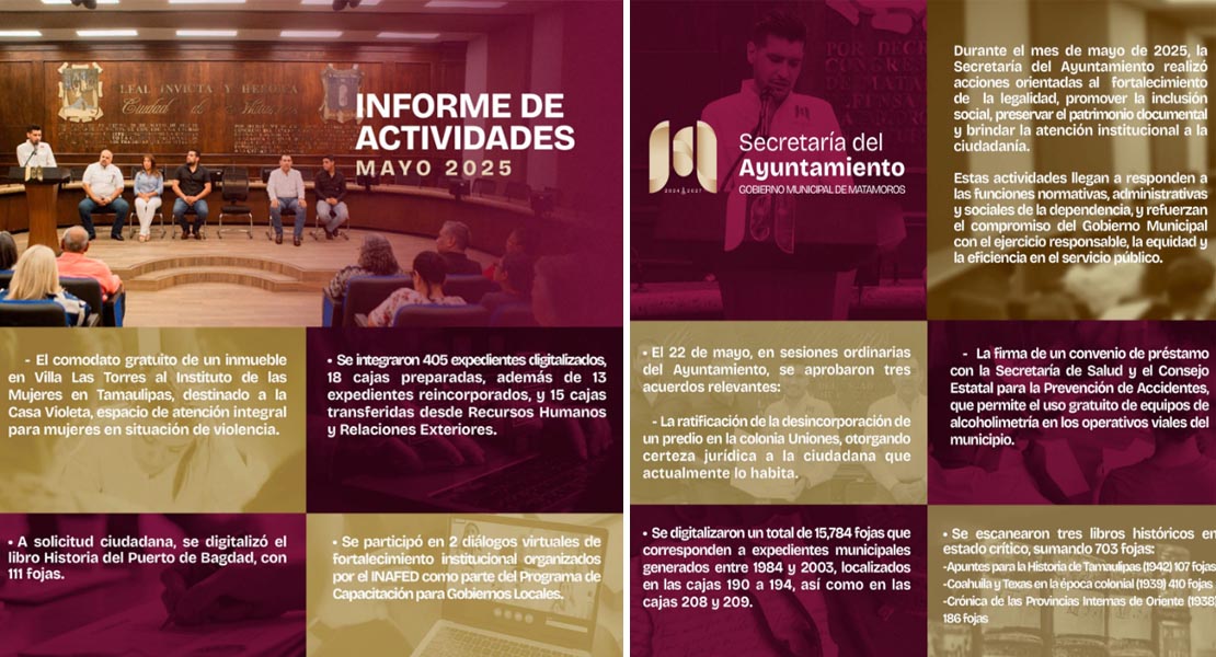 H. Matamoros, Tamaulipas.- El Gobierno de Matamoros, que preside Beto Granados, informó que en mayo, la Secretaría del Ayuntamiento llevó a cabo acciones clave para fortalecer la legalidad y promover la inclusión social en el municipio. Estas acciones reflejan el compromiso del gobierno con el servicio público eficiente, equitativo y cercano a las y los matamorenses, bajo el enfoque de un Gobierno de Territorio y un Gobierno Cercano al Pueblo.