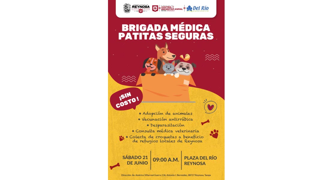 Reynosa, Tam.- La Brigada Patitas Seguras, que impulsa el Presidente Municipal Carlos Peña Ortiz, ofrece servicios médicos veterinarios gratuitos y se llevará a cabo en la plaza comercial Del Río este sábado 21 de junio a partir de las 9:00 de la mañana.