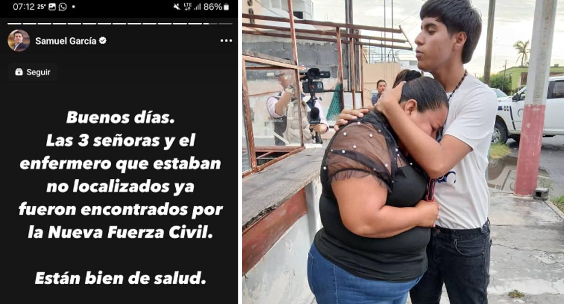 Están com vida Natalia Gisela Ramírez Nolasco, María de la Luz Lara Lara, Teresa Lizbeth Pérez Fuentes y Pedro Antonio Lorenzo Martínez. Samuel García gobernador de #NuevoLeón publicó en sus cuentas de Facebook e Instagram que fueron localizados y que están bien de salud.