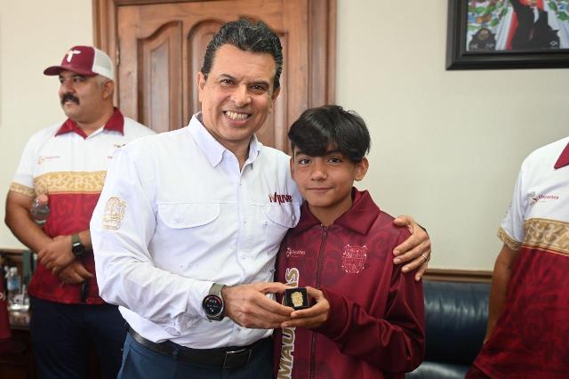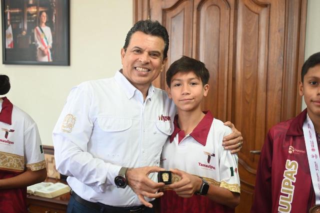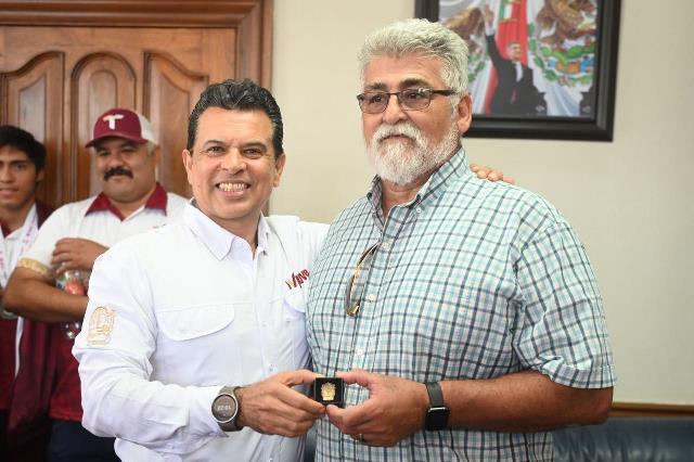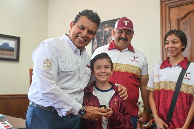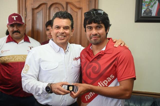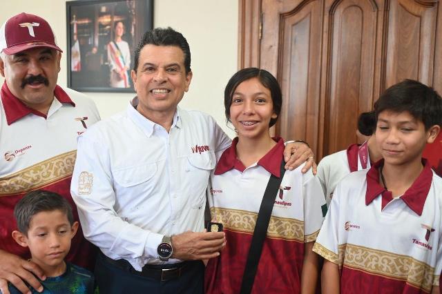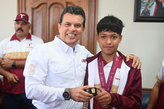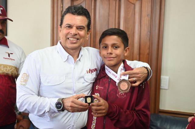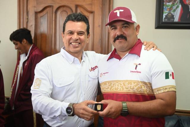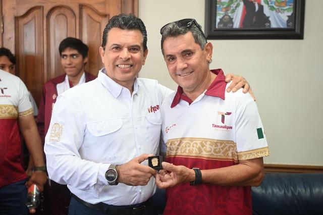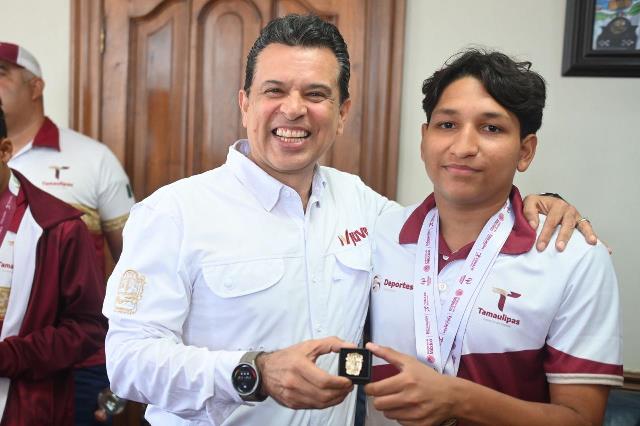 Acompañado del Jefe de Deportes del Municipio, Carlos Pizaña, entregó una insignia del Gobierno de Victoria, con el exhorto a seguir esforzándose para alcanzar los primeros lugares en las próximas competencias y escribir su historia con medallas de campeón.