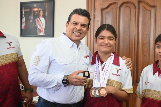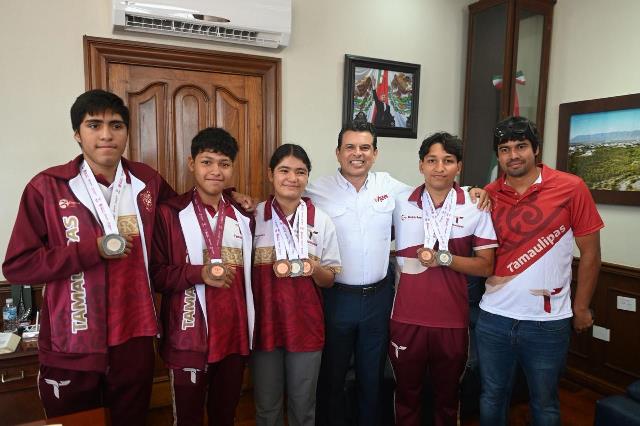 “Con su constancia, perseverancia y esfuerzo han puesto a Victoria, la Capital de Tamaulipas, en lo más alto del deporte nacional, son un orgullo para nuestra ciudad”, expresó Gattás Báez al recibir en su despacho al grupo de atletas, entrenadores y padres de familia.
