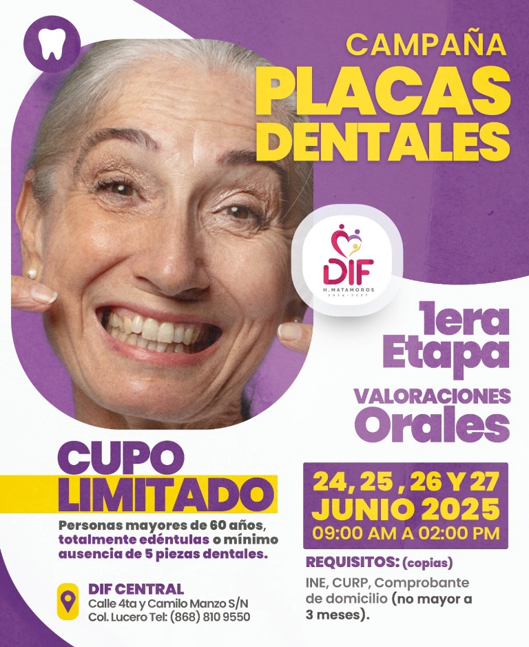 Las valoraciones se llevarán a cabo los días 24,25,26 y 27 de junio en las instalaciones de la oficina central del DIF Matamoros, ubicada en calle 4ta y Camilo Manzo s/n, colonia Lucero, en un horario de 9:00 a.m. a 2:00 p.m., donde personal del área dental brindará la atención correspondiente.