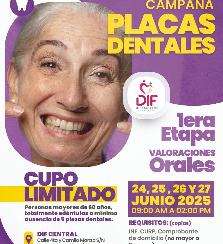 Matamoros, Tam.- El Sistema DIF Matamoros que preside la Lic. Ana Ariceaga de Granados, continúa haciendo la invitación a los adultos mayores para sumarse a las acciones que buscan mejorar su calidad de vida fortaleciendo su salud bucal para brindarles mayor confianza en su vida diaria, a través de la Campaña Municipal de “Placas Dentales”. Las valoraciones se llevarán a…