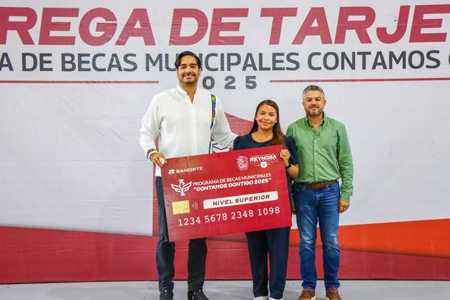 Reynosa, Tam.- El Presidente Carlos Peña Ortiz entregó las tarjetas del Programa de Becas Municipales “Contamos Contigo” 2025 a estudiantes universitarios, un programa social que brinda apoyo económico a estudiantes de diferentes niveles escolares para fomentar la educación y el desarrollo social en la comunidad.