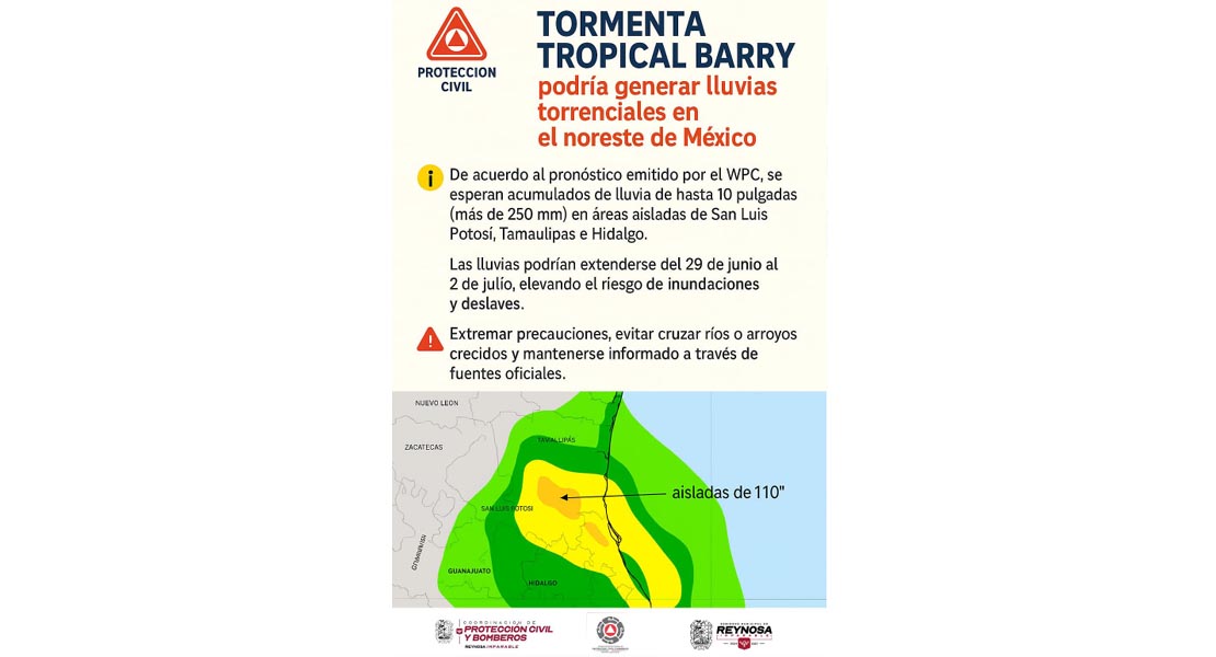 Reynosa, Tam.- La Coordinación de Protección Civil y Bomberos, del Gobierno del Alcalde Carlos Peña Ortiz, informa que la depresión tropical 2 evolucionó a Tormenta Tropical, identificada como “Barry”, y se ubica a 265 kilómetros al sureste de Tampico, Tamaulipas, con vientos sostenidos de 65 km/h y ráfagas de viento estimadas en 85 km/h..