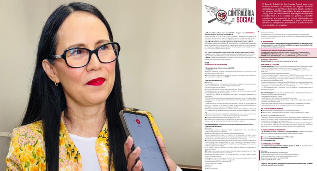 Ciudad Victoria, Tamaulipas.- A fin de promover la vigilancia ciudadana en la gestión pública para fomentar la transparencia y rendición de cuentas que incide en evitar actos de corrupción, la Contraloría Gubernamental del Estado de Tamaulipas a cargo de Norma Angélica Pedraza Melo, da a conocer la convocatoria del “ V Premio Estatal de Contraloría Social”, donde pueden participar Comités de Contraloría Social, Organizaciones de la Sociedad Civil y a la sociedad en general con actitud solidaria hacia la comunidad.