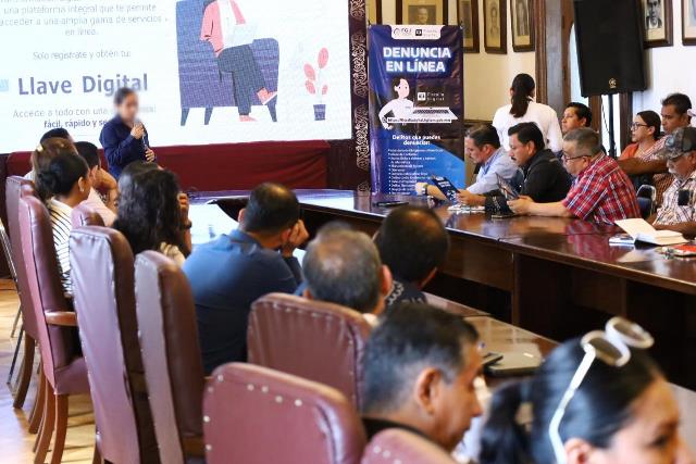 Sobre la competencia de esta herramienta digital empleados municipales y personal de la FGJE reunidos en la Sala de Cabildo, intercambiaron información sobre la eficiencia y alcance del nuevo sistema de justicia para denuncia del delito en la lucha contra la impunidad.