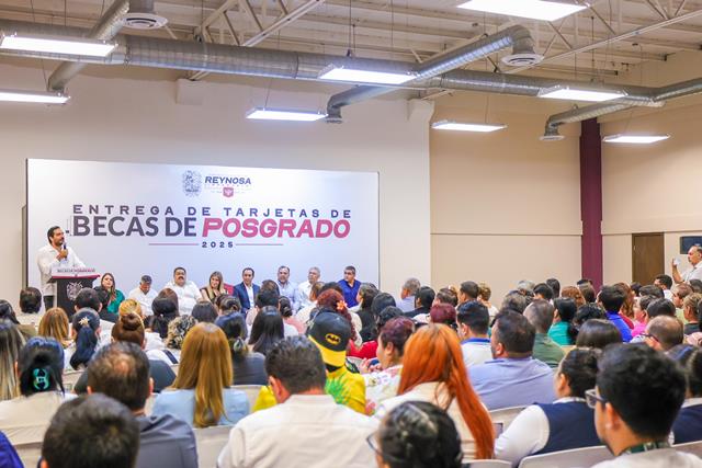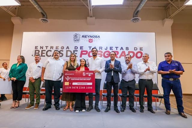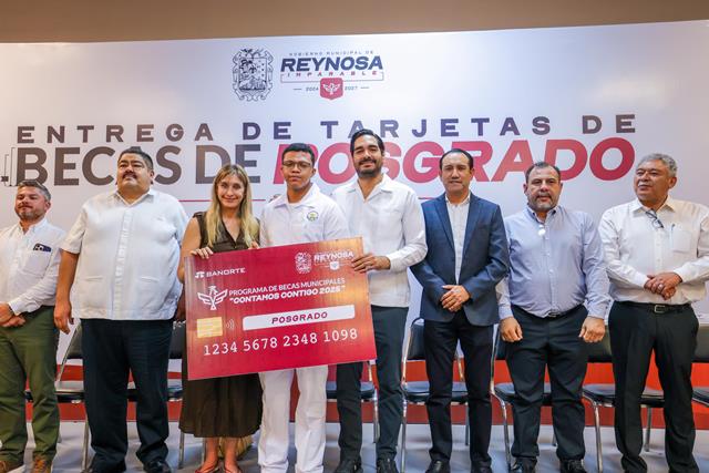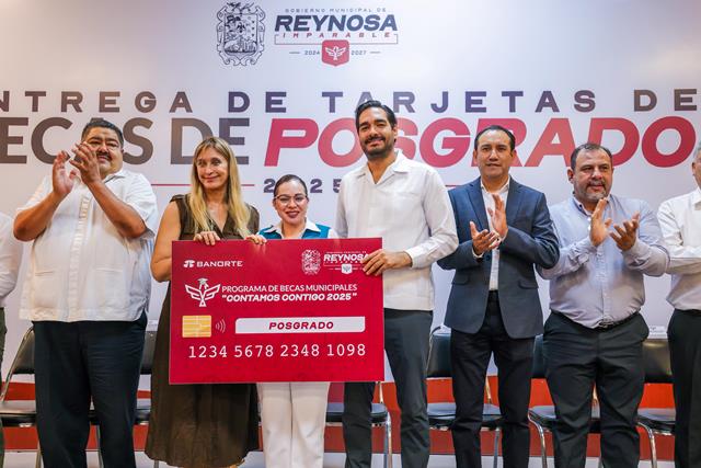 Reynosa, Tam.- El Presidente Municipal de Reynosa, Carlos Peña Ortiz, entregó las Tarjetas de Becas de Posgrado “Contamos Contigo” 2025, para apoyar la preparación de profesionales, buscando elevar su nivel académico y contribuir al desarrollo de la ciudad.