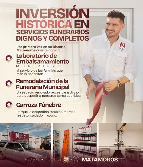 H. Matamoros, Tamaulipas.- En un esfuerzo sin precedentes por dignificar los servicios funerarios en Matamoros, el Gobierno Municipal que preside el alcalde, Beto Granados ha realizado una inversión histórica que marca un antes y un después en esta importante área de atención social. Por primera vez en la historia del municipio, las familias contarán con infraestructura y servicios públicos funerarios que garantizan el respeto, la calidad y la calidez humana en los momentos más difíciles.