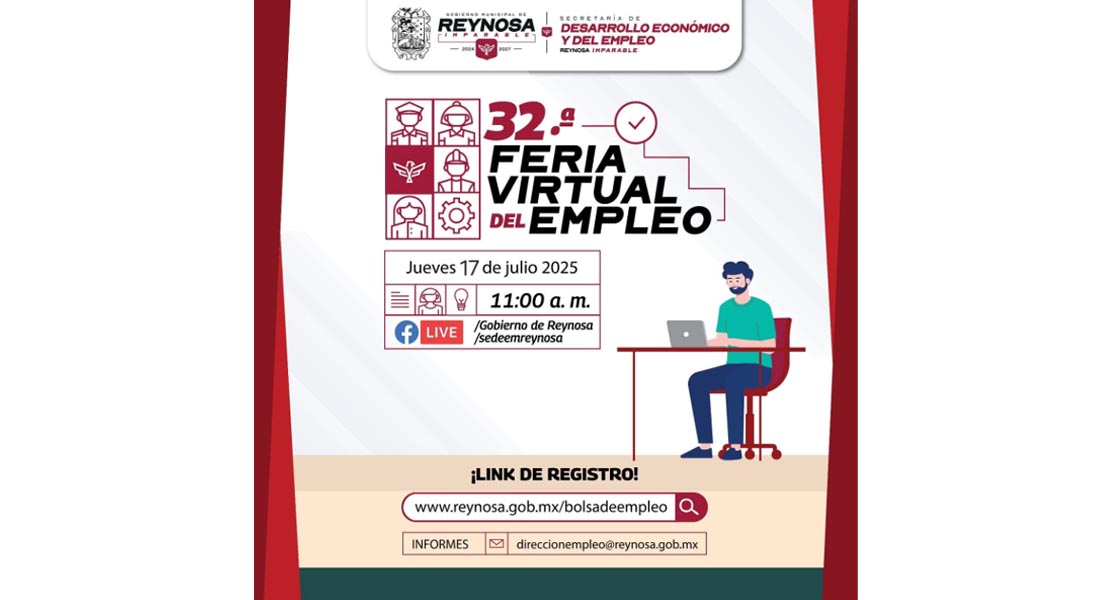 Reynosa, Tam.- Mediante la 32° Feria Virtual de Empleo, el Alcalde Carlos Peña Ortiz promueve la ocupación laboral con trabajos que cumplen con las prestaciones de Ley, para que más reynosenses accedan a mejores oportunidades.