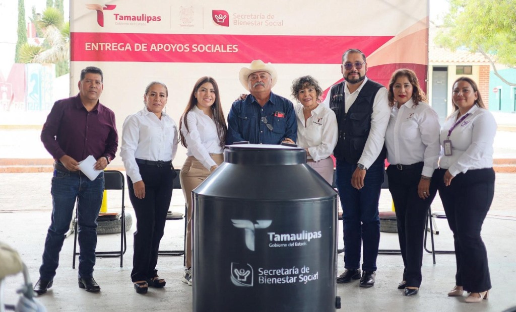 La secretaria de Bienestar Social, Silvia Casas González, junto a la presidenta municipal, Sindy Paoleth Monita Ramírez, encabezó un evento en la plaza principal de ese municipio del altiplano tamaulipeco, en el que se hizo entrega de 70 tinacos con capacidad de 600 litros para el almacenamiento de agua.