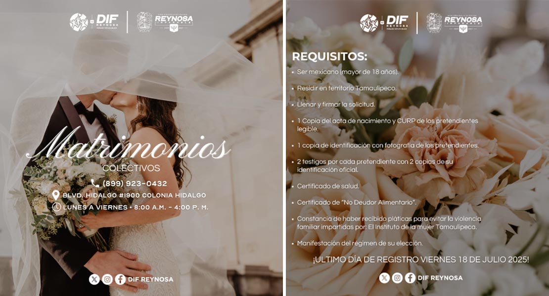 Reynosa, Tam.- El Sistema DIF-Reynosa que preside Carlos Luis Peña Garza, invita a registrarse en la Campaña de Matrimonios Colectivos 2025; hoy, viernes 18 de julio, es el último día para poder ser beneficiados con estas acciones que dan certeza legal a las familias.