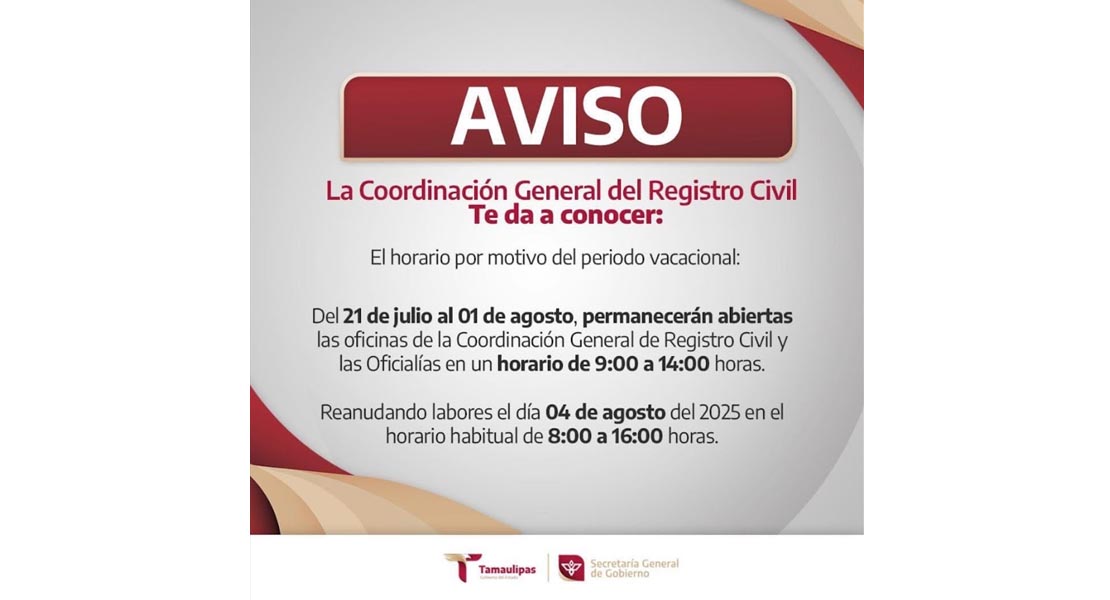 Ciudad Victoria, Tamaulipas.- La Coordinación General del Registro Civil informa a la ciudadanía que, en cumplimiento con la instrucción del gobernador del Estado, Américo Villarreal Anaya, de mantener una administración cercana y comprometida con el pueblo, se continuará brindando atención al público durante el período vacacional comprendido del 21 de julio al 1 de agosto, en un horario especial de 9:00 a 14:00 horas.