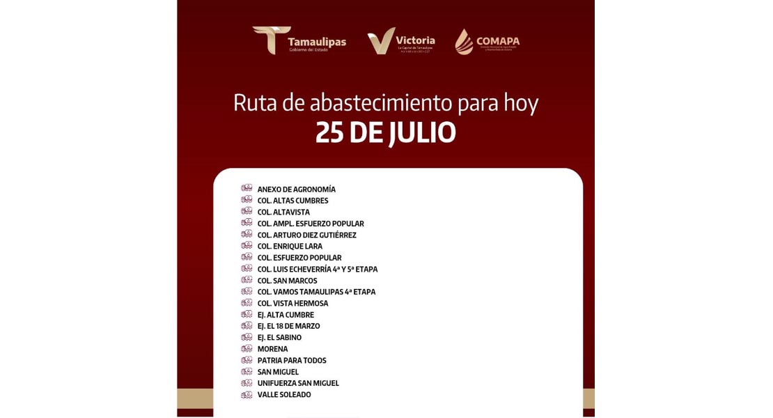 En COMAPA Victoria trabajamos para que el agua llegue a cada rincón de la ciudad. Este día, el servicio de abastecimiento se realiza en:
