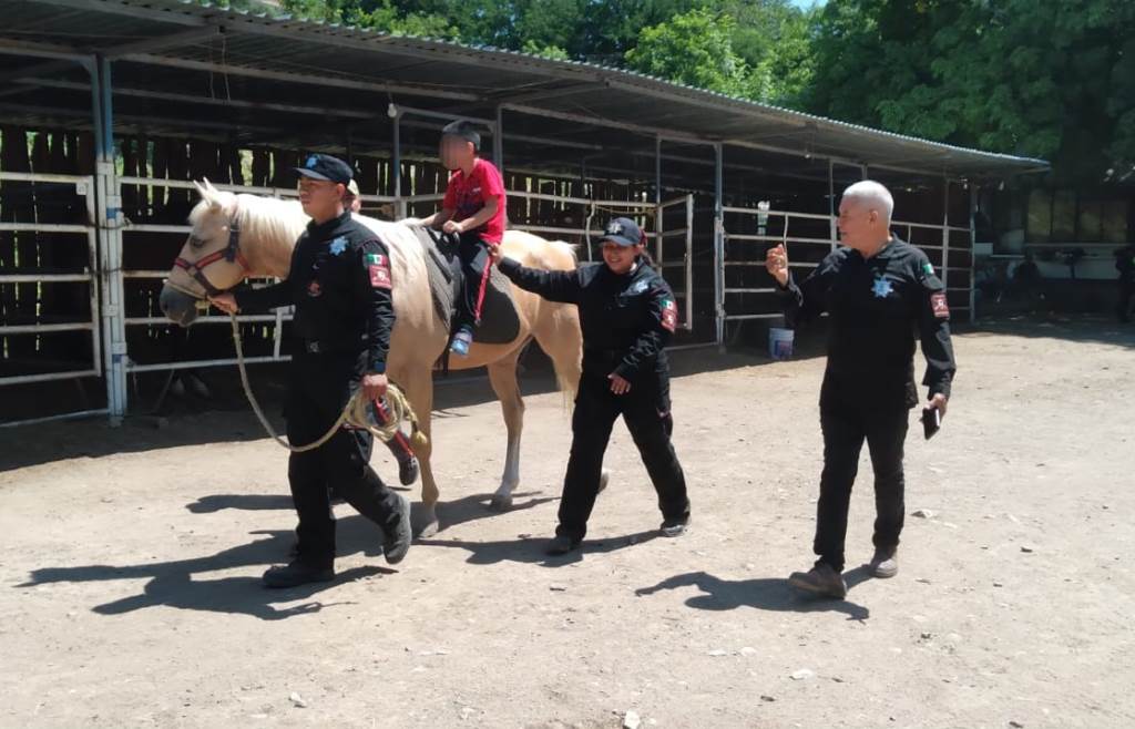 La actividad denominada ‘’Equinoterapia Símbolo del Infinito’’ es coordinada por personal capacitado de esta asociación civil e integra a jinetes y equinos de la Guardia Estatal.