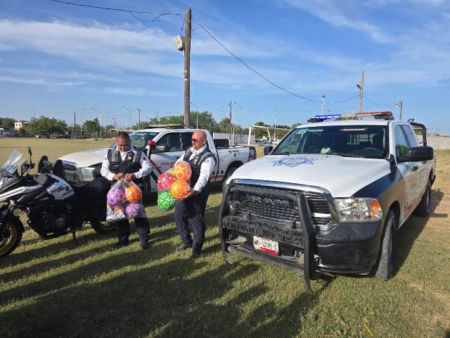 Reynosa, Tam.- Elementos de la Secretaría de Seguridad Pública, Tránsito y Vialidad Municipal, respaldando la política del Alcalde Carlos Peña Ortiz, en el fomentar a la juventud en el deporte, donaron balones a niños y niñas que juegan en las canchas de la colonia Almaguer.