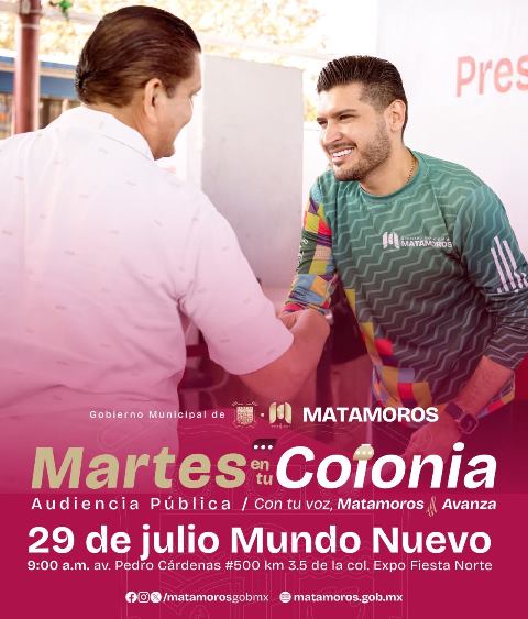 H. Matamoros, Tamaulipas.- El Gobierno de Beto Granados, comprometido con la cercanía, el diálogo y la atención directa, invita a la población a participar en una nueva edición del programa “Martes en tu colonia”, que este 29 de julio tiene como sede el Centro de Convenciones Mundo Nuevo. Será a partir de las 9:00 de la mañana.