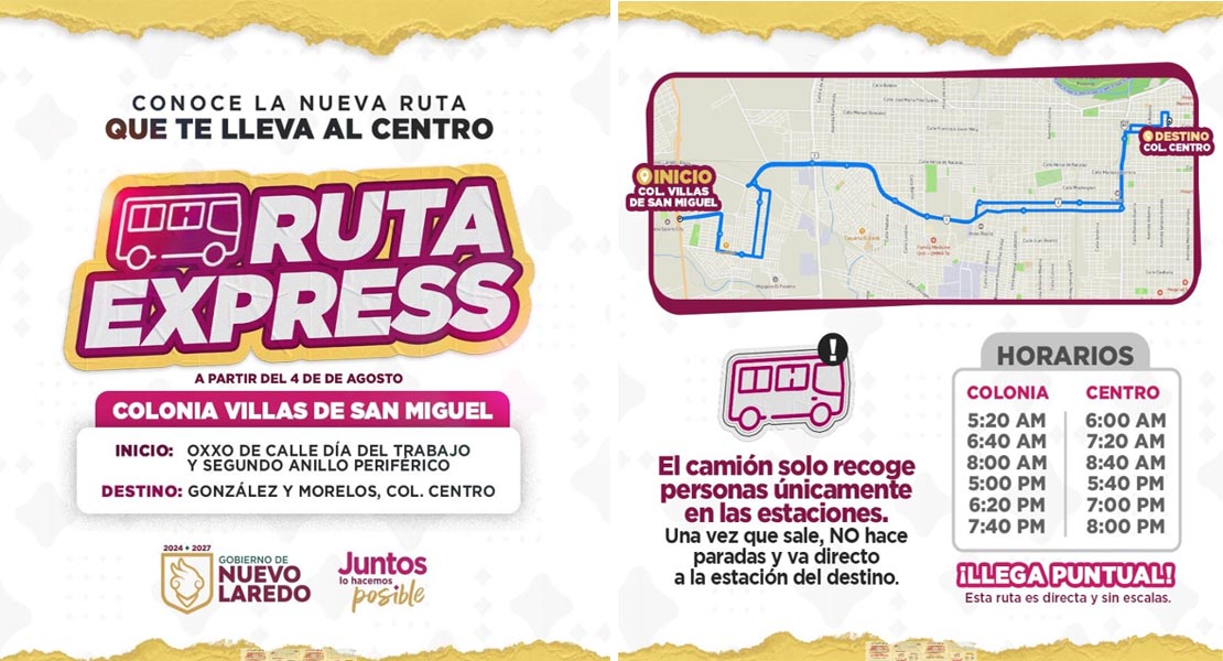 Nuevo Laredo, Tam.- El Gobierno Municipal de Nuevo Laredo, encabezado por la presidenta Carmen Lilia Canturosas Villarreal en coordinación con el Gobierno del Estado ponen en marcha a partir de este lunes 4 de agosto dos nuevas rutas exprés de transporte público, con el objetivo de mejorar la movilidad urbana y brindar un servicio más rápido, eficiente y directo a la ciudadanía.