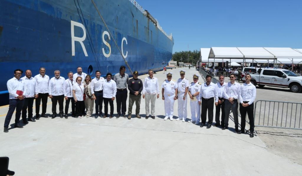 La ceremonia incluyó el banderazo de salida al embarque de los primeros vehículos que abordaron el buque Integrador, anclado en el nuevo muelle.