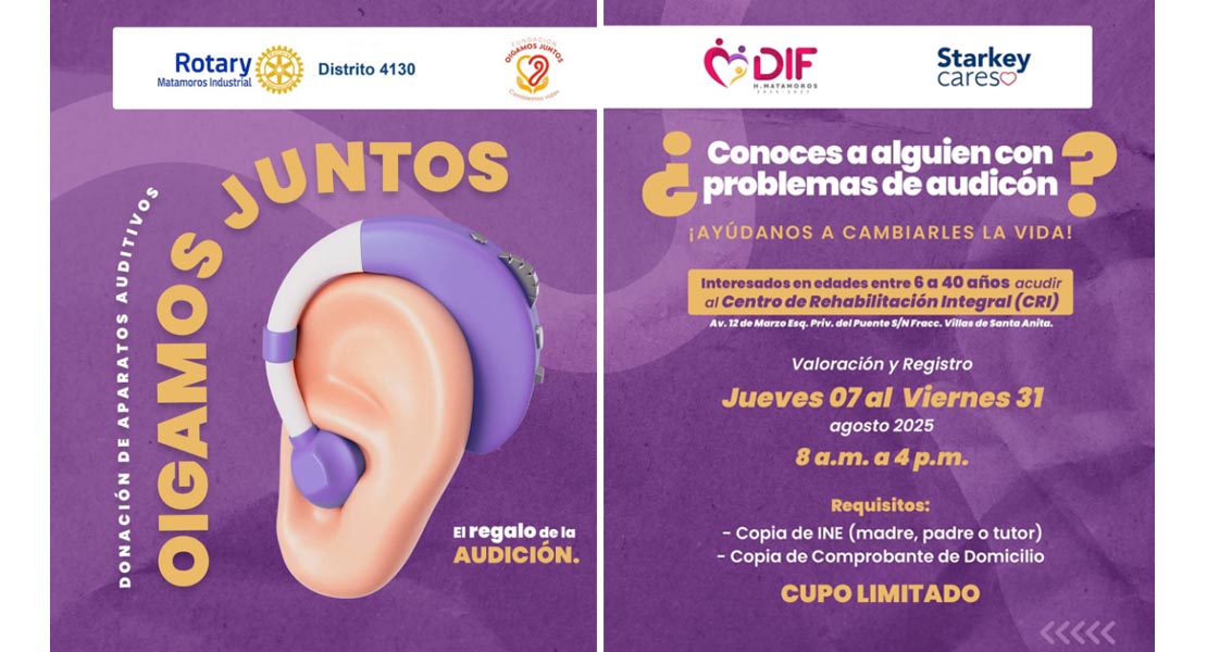 Matamoros, Tam.- Trabajando de la mano para llevar el regalo de la audición a personas con alguna discapacidad auditiva, el Sistema DIF Matamoros, que preside la Lic. Anita de Granados y en coordinación con la Fundación “Oigamos Juntos”, Club Rotario Matamoros Industrial y Starkey Cares, hacen la invitación a la población para sumarse a la Campaña de Donación de Aparatos Auditivos para niñas, niños, adolescentes y adultos en edades de 06 a 40 años de edad.