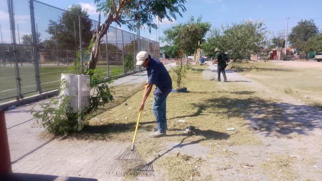 – En la calle Azucena con calle Cuauhtémoc, colonia Miguel Ángel, se efectuó la limpieza de plaza pública y cancha de fútbol. El trabajo incluyó corte de maleza, chapoleo, poda y tala de árboles, raspado y barrido de banquetas y cordones.