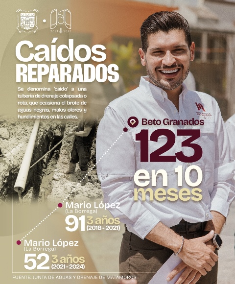 Matamoros, Tam.- En tan solo 10 meses de gestión como alcalde de Matamoros, Beto Granados ha demostrado con hechos y números que la eficacia y el compromiso real con la ciudadanía son posibles. Con un total de 123 caídos rehabilitados entre 2024 y 2025, Beto Granados supera ampliamente los resultados de 2 administraciones anteriores.