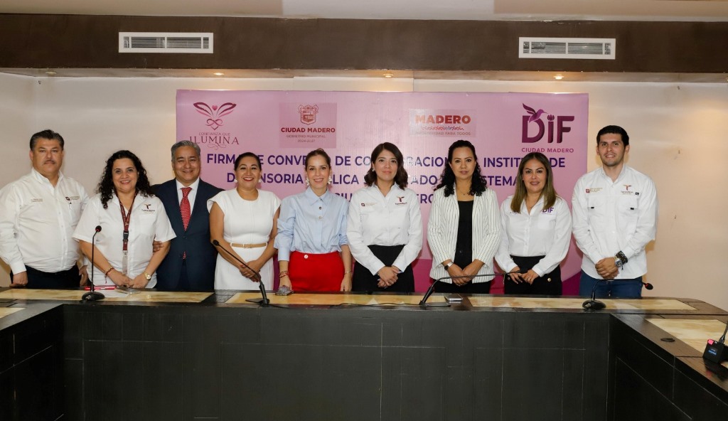 La firma del convenio se llevó a cabo en la Sala de Cabildo del H. Ayuntamiento de Ciudad Madero, con la participación de la presidenta del DIF, Dunia Marón, y la directora general del organismo, Neffertitti Constantino Martínez.
