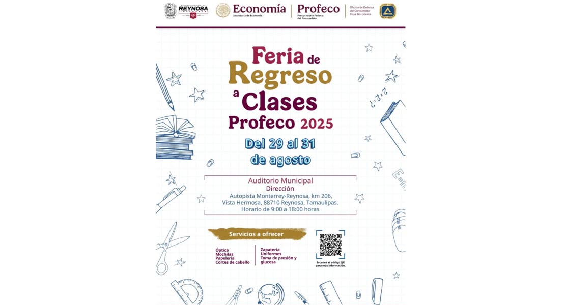 Reynosa, Tam.- El Alcalde Carlos Peña Ortiz te invita a asistir a la Feria de Regreso a Clases 2025, donde podrás canjear tus Cupones de $500.00 aportados por el Gobierno Municipal para apoyar económicamente la educación de tus hijos; del 29 al 31 de agosto en el Auditorio Municipal de 9:00 a 18:00 horas podrás utilizarlos para adquirir productos para estudiantes de todos los grados académicos.
