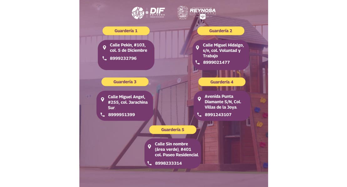 El Gobierno de Reynosa a través del DIF Municipal, pone a disposición de la ciudadanía las guarderías ubicadas en distintos puntos de la ciudad; la Guardería 1 en la colonia 5 de Diciembre, la Guardería 2 en la colonia Voluntad y Trabajo, la Guardería 3 de la colonia Jarachina Sur, la Guardería 4 en la colonia Villas de la Joya, y la Guardería 5 en la colonia Paseo Residencial.