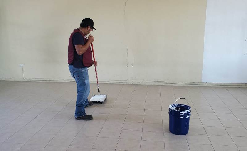 Se continúa con el apoyo de personal para el pintado de aulas en el jardín de niños María E. Pereira, ubicado en la calle Hawai con prolongación Londres, de la colonia Cañada.