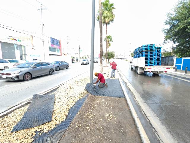 Esta labor incluye la instalación de maya antimaleza en el bulevar Del Maestro hoy martes 26 de agosto, trabajos de mantenimiento y embellecimiento que las cuadrillas realizan de forma permanente.