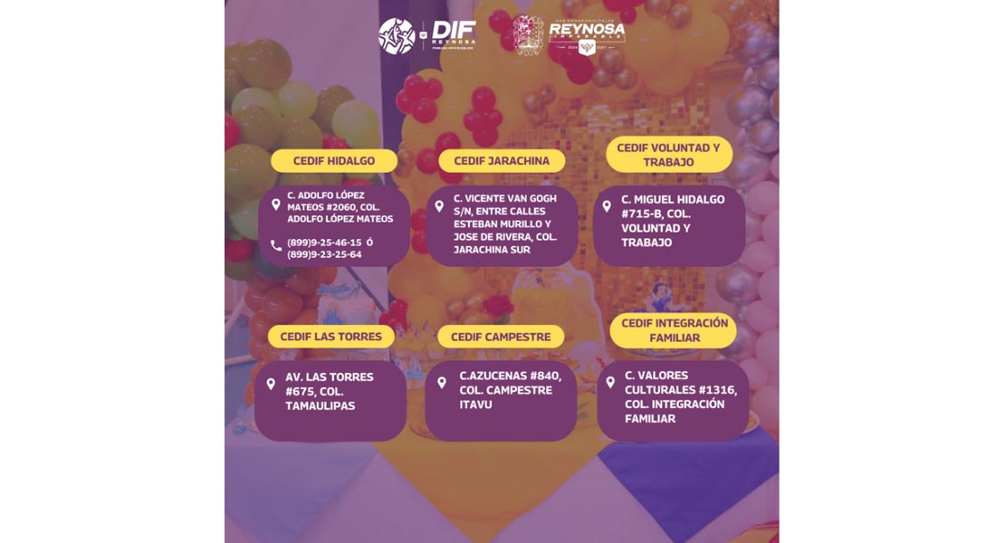 Las personas interesadas pueden acudir a las oficinas del DIF-Reynosa, en un horario de 8:00 de la mañana a 4:00 de la tarde o comunicarse a los teléfonos 8999254615 8999232564, para mayor información sobre inscripciones y disponibilidad.