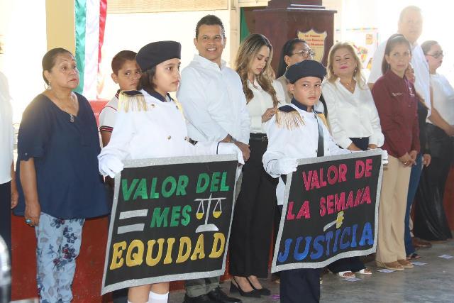 Con honores a la bandera de México y Tamaulipas, presidió el acto protocolario en compañía de autoridades educativas y comunidad escolar, ante quienes reiteró en su mensaje el compromiso de su gobierno municipal de seguir invirtiendo en la dignificación de espacios donde se fortalezca la educación de la niñez de la Capital de Tamaulipas.