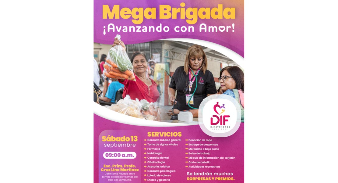 Matamoros, Tam.- El Sistema DIF Matamoros que preside la Lic. Ana Ariceaga de Granados, invitan a las familias que habitan en la colonia Loma Alta y alrededores, a asistir a la Mega Brigada Asistencial “Avanzando con Amor”, en donde se otorgarán los diversos servicios que ofrece este organismo de manera gratuita.