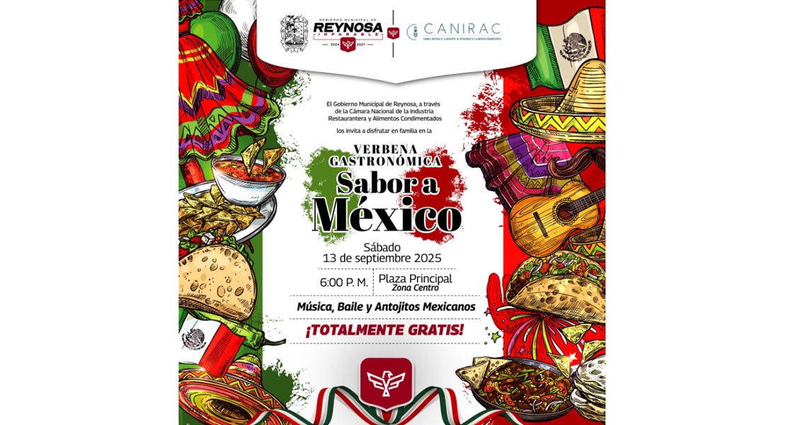 Reynosa, Tam.- Hoy 13 de septiembre disfruta del Sabor a México, una gran verbena gastronómica organizada por el Presidente Municipal Carlos Peña Ortiz, quien a través del Gobierno de Reynosa y de la Cámara Nacional de la Industria Restaurantera y Alimentos Condimentados para que la disfrutes en familia.