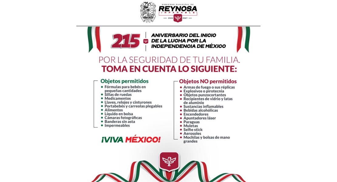 Reynosa, Tam.- Prepárate para disfrutar la celebración más mexicana en Reynosa, este lunes 15 de septiembre te esperamos a las 6:00 de la tarde en la plaza principal Miguel Hidalgo, mira lo que puedes llevar contigo al evento para evitar riesgos a la integridad de los asistentes.