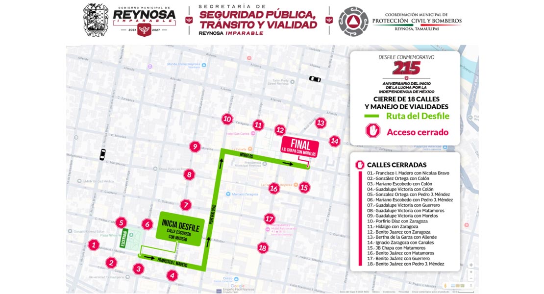 Reynosa, Tam.- La Dirección de Tránsito y Vialidad informa que por seguridad para los participantes del Desfile Conmemorativo del 16 de Septiembre, 18 calles de la Zona Centro serán cerradas parcialmente, conoce cuáles estarán delimitadas durante el evento.
