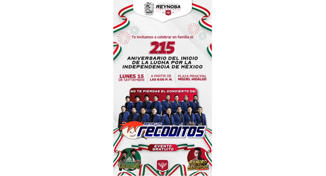 Reynosa, Tam.- ¡El Grito es hoy! El Presidente Municipal Carlos Peña Ortiz te invita a la celebración del 215 Aniversario del Inicio de la Lucha por la Independencia de México, a partir de las 6:00 de la tarde en la plaza principal con la actuación estelar de la Banda Los Recoditos, un evento gratuito para toda la familia.