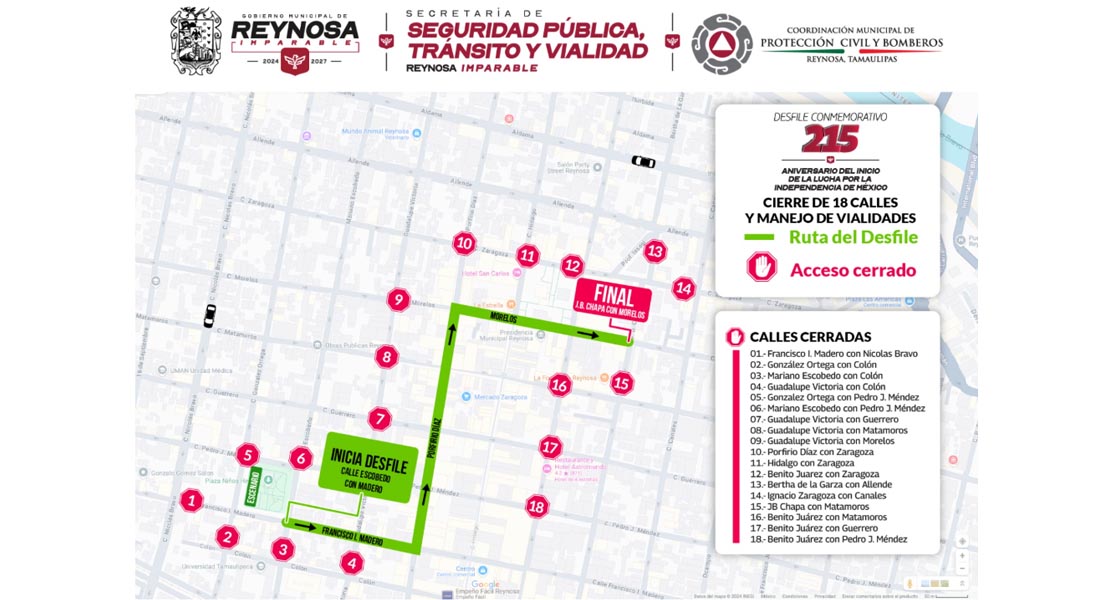 Reynosa, Tam.- El Gobierno del Presidente Carlos Peña Ortiz invita a toda la población a presenciar el Desfile Conmemorativo del 215 Aniversario del Inicio de la Lucha por la Independencia de México, este martes 16 de septiembre a partir de las 9:00 de la mañana en el templete del Palacio Municipal.