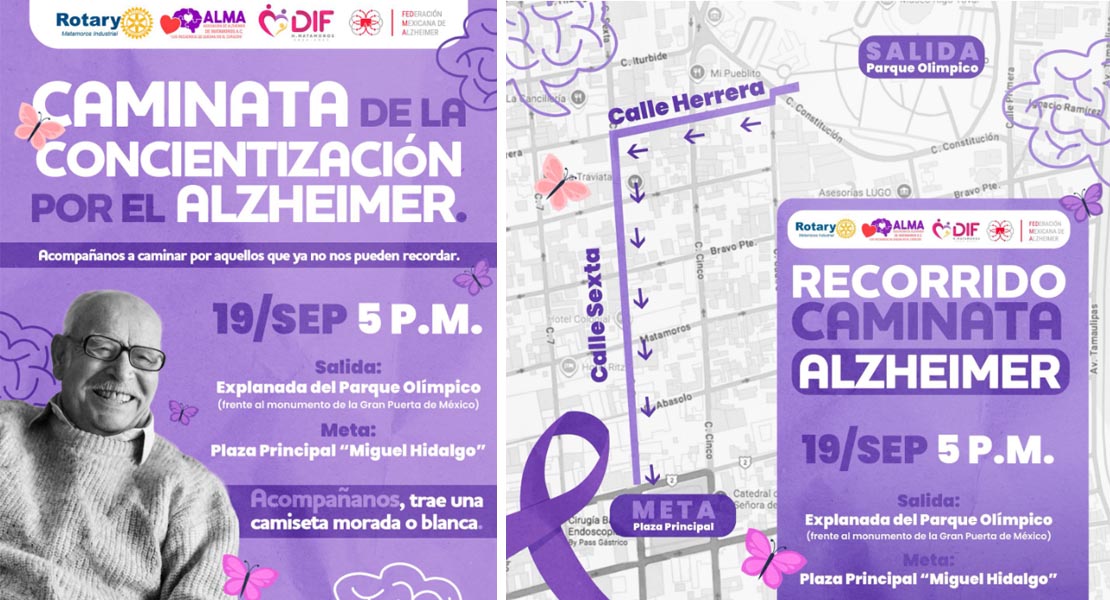Matamoros, Tam.- El Sistema DIF Matamoros que preside Anita de Granados en coordinación con la Asociación de Alzheimer de Matamoros A.C. (ALMA), hacen la invitación a la población en general a sumarse a la caminata de concientización del Alzheimer, que tiene por objetivo difundir un mensaje de amor y reflexión sobre esta enfermedad degenerativa y progresiva que afecta la memoria.