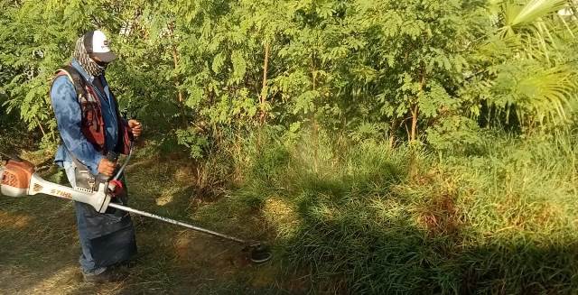 Esta mañana de jueves 18 de septiembre, cuadrillas municipales realizan trabajo de corte de maleza, limpieza general y poda de árboles en la plaza pública ubicada en la calle Nogales con calle Mezquites en el fraccionamiento Los Robles.