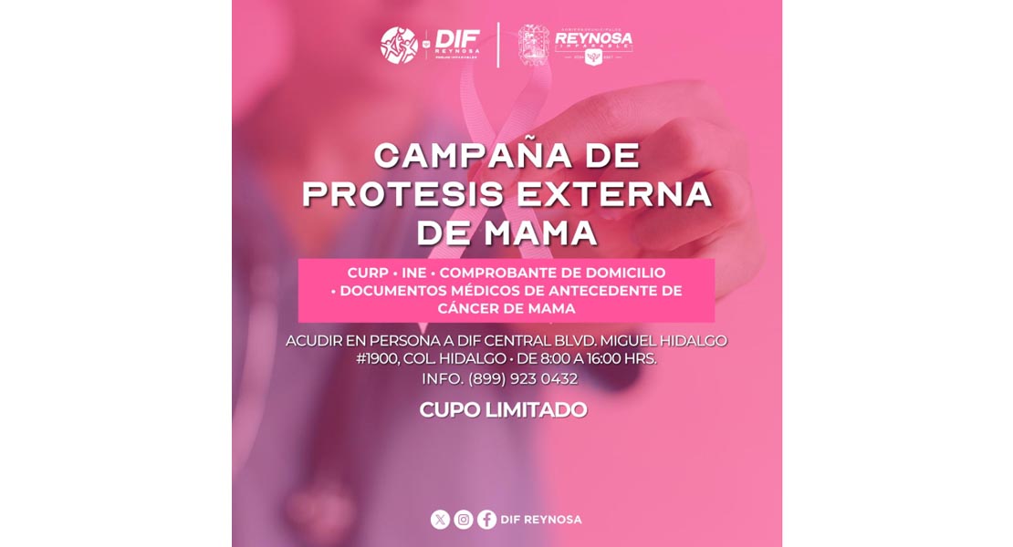 Reynosa, Tam.- El Sistema DIF-Reynosa que preside Carlos Luis Peña Garza, dio inicio al registro para la Campaña de Prótesis Externa de Mama, dirigida a mujeres sobrevivientes de cáncer que requieran este apoyo para mejorar su calidad de vida y recuperar confianza en su proceso de rehabilitación.