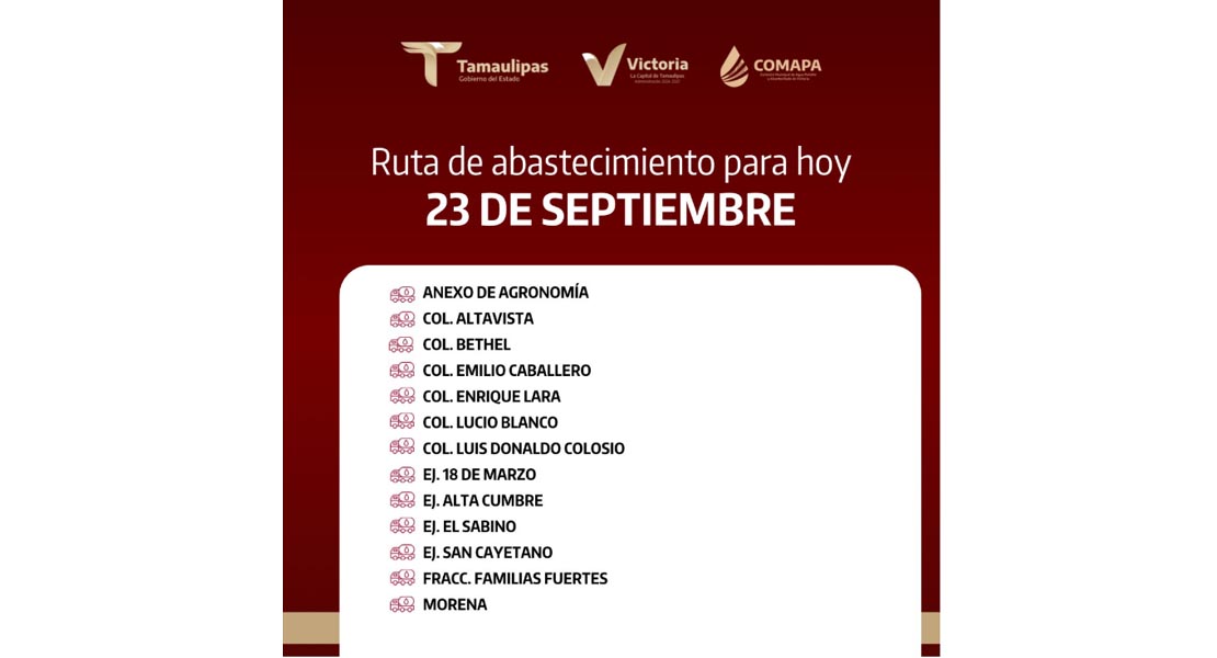 En COMAPA Victoria trabajamos para que el agua llegue a cada rincón de la ciudad. Este día, el servicio de abastecimiento se realiza en:
