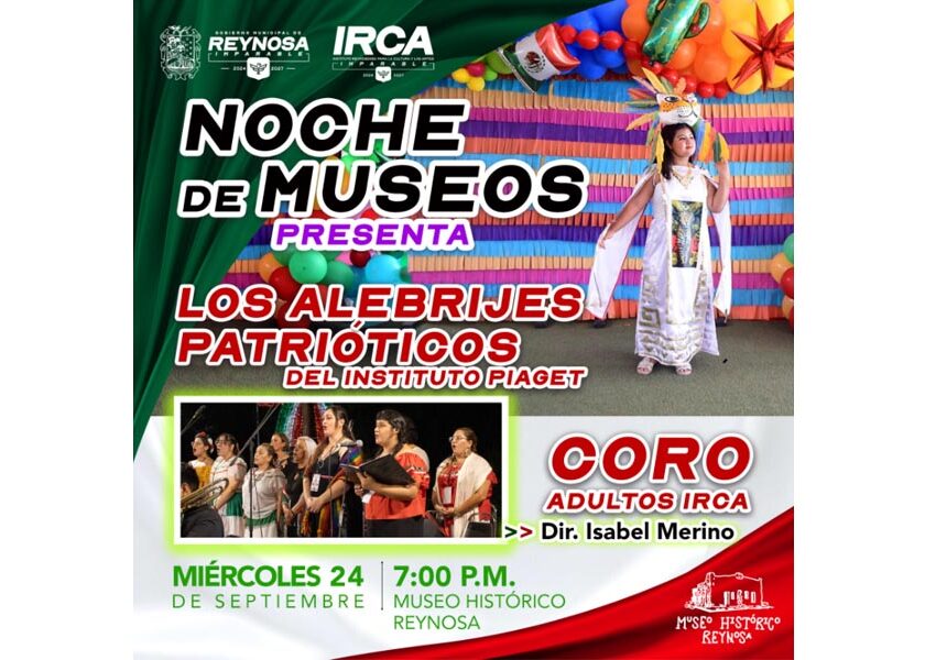 Reynosa, Tam.- Siguiendo las instrucciones del Alcalde Carlos Peña Ortiz, el Instituto Reynosense para la Cultura y las Artes invita a disfrutar la Noche de Museos este miércoles 24 de septiembre a las 7:00 P. M. en el Museo Histórico Reynosa. Como parte del programa se presentarán los alebrijes patrióticos del Instituto Piaget, figuras que simbolizan la fuerza, la unión…