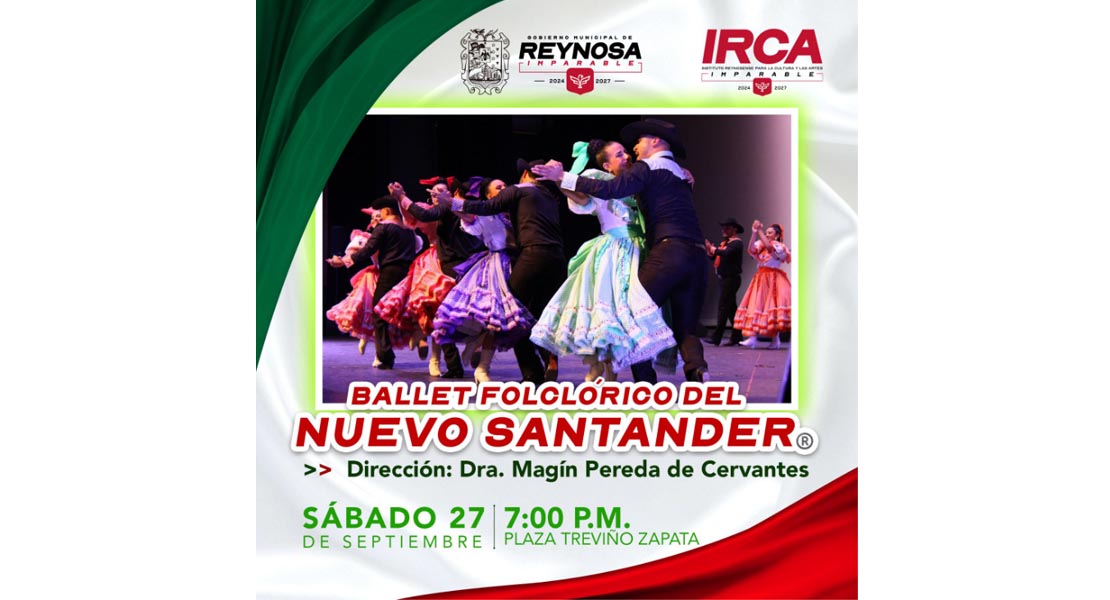 Este sábado 27 de septiembre a las 7:00 P. M., en la plaza Treviño Zapata se presentará el Ballet Folclórico del Nuevo Santander, bajo la dirección de la Doctora Magín Pereda de Cervantes. La entrada es libre.