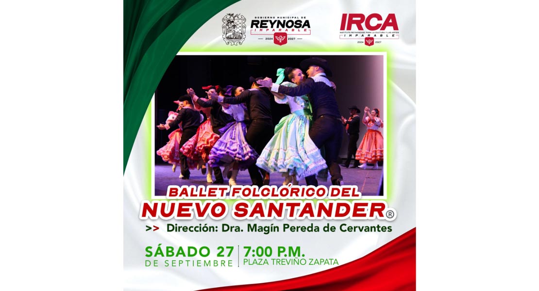 Este sábado 27 de septiembre a las 7:00 P. M., en la plaza Treviño Zapata se presentará el Ballet Folclórico del Nuevo Santander, bajo la dirección de la Doctora Magín Pereda de Cervantes. La entrada es libre.