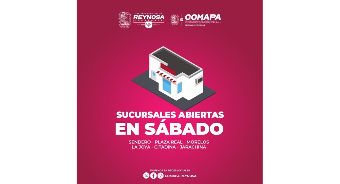 Reynosa, Tam.- La Comisión Municipal de Agua Potable y Alcantarillado de Reynosa invita a la ciudadanía a visitar las sucursales que permanecen abiertas en sábado para realizar el pago de los servicios de agua potable y drenaje, facilitando así que los usuarios puedan cumplir con este importante compromiso sin afectar sus actividades diarias.